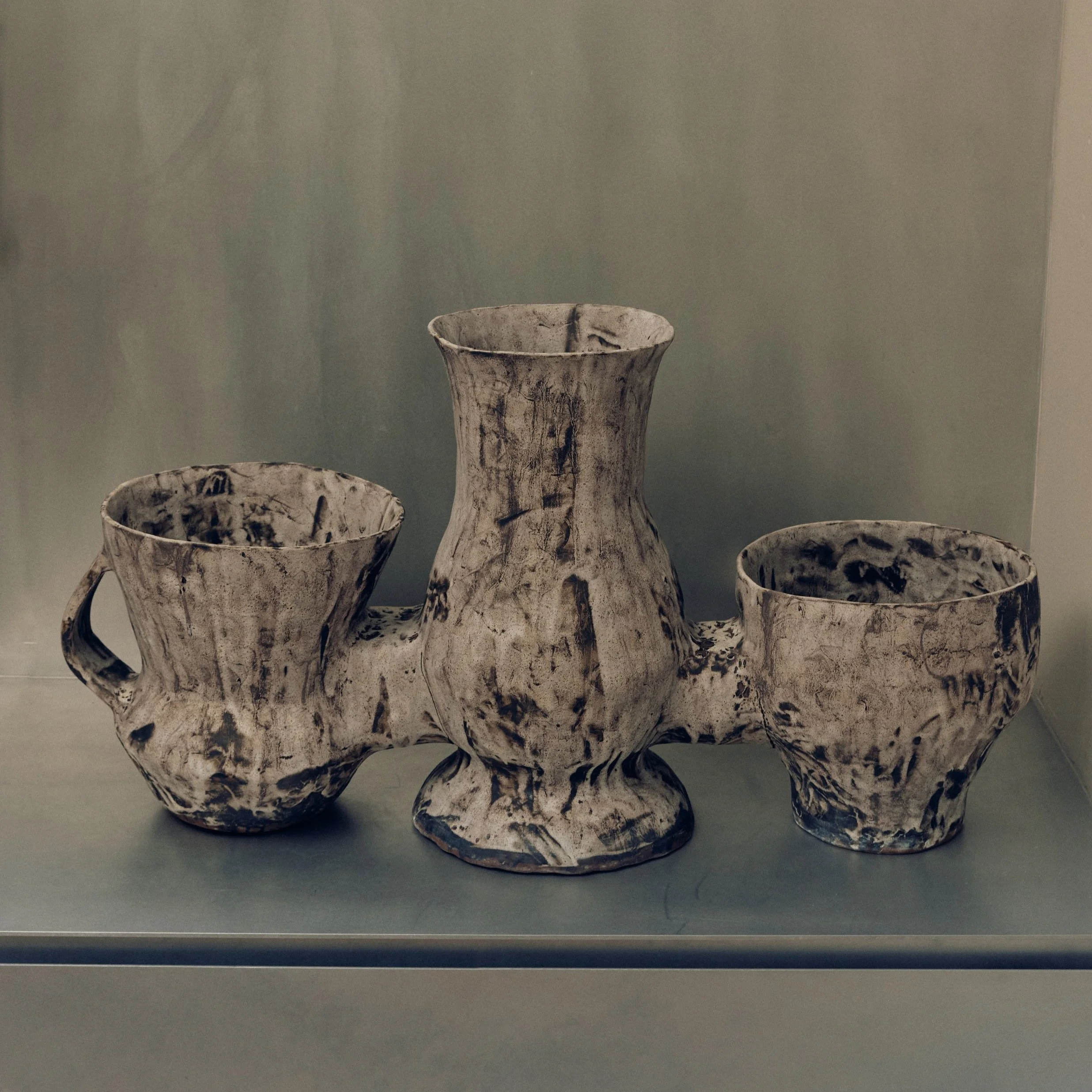 Danielle’s hybrid forms evoke the past while remaining contemporary, sitting between the ritualistic and the playful. The work invites contemplation, challenging the spaces between historical and modern, functional and sculptural, connection and separation.