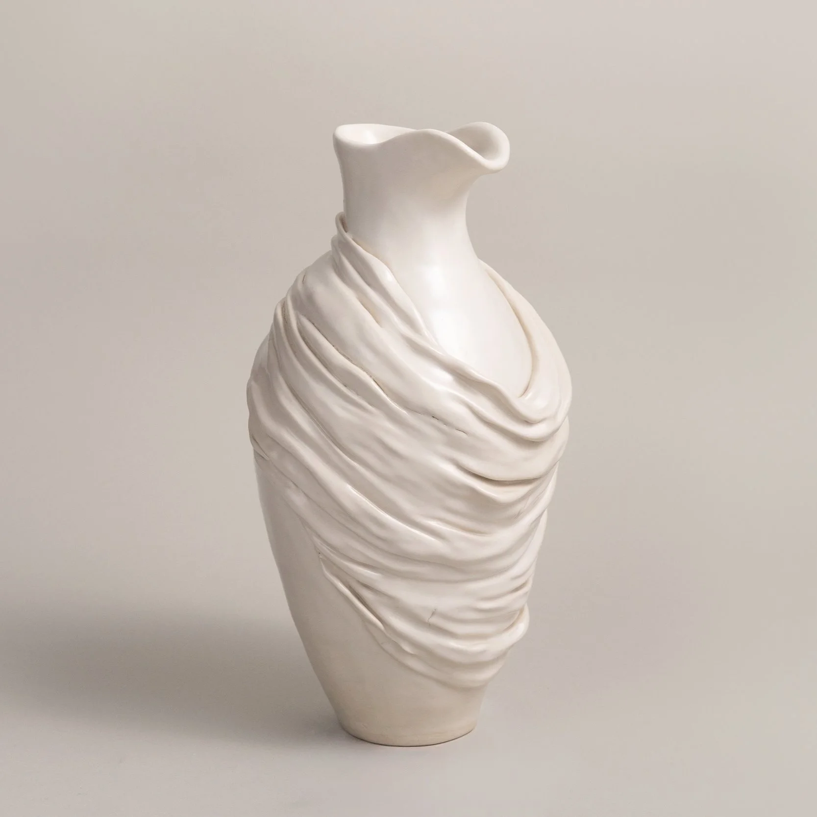 The sculpted vessels by Alexandra Howie are of her burgeoning practice bring forth what lies hidden within – allowing the intangible to take physical form. Archetypal forms are meticulously sculpted to render them as if swathed in folds of fabric and wet drapery. Howie’s distinctive work resonates with both tradition and innovation, integrating rich historical references with intimations of culture and ritual.